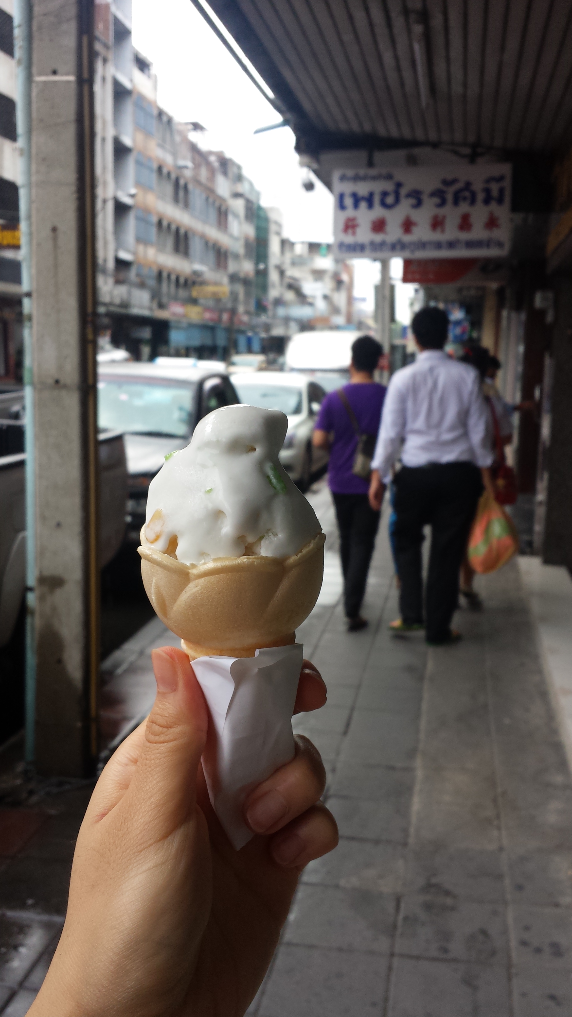 By the time we finish looking around and step outside again, the rain had stopped. I buy my first Thai street food from the very first vendor that passes in front of me, which turns out to be sweetcorn ice cream. It tastes like cheap vanilla ice cream with a hint of nutty flavour, with bits of yellow sweet corns. The green bits, I cannot work out what they are.