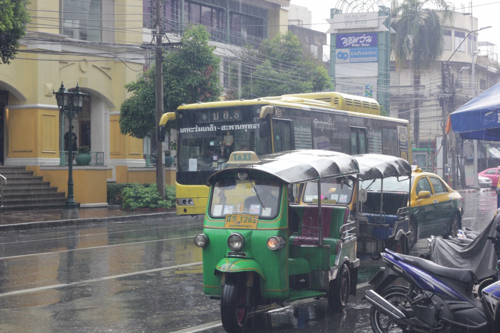 The sky is grey, thick and heavy , but it doesn’t make Bangkok grim one little bit. It’s a city full of colours – taxis are fuchsia pink, tuk-tuks green, and buses orange and red.
