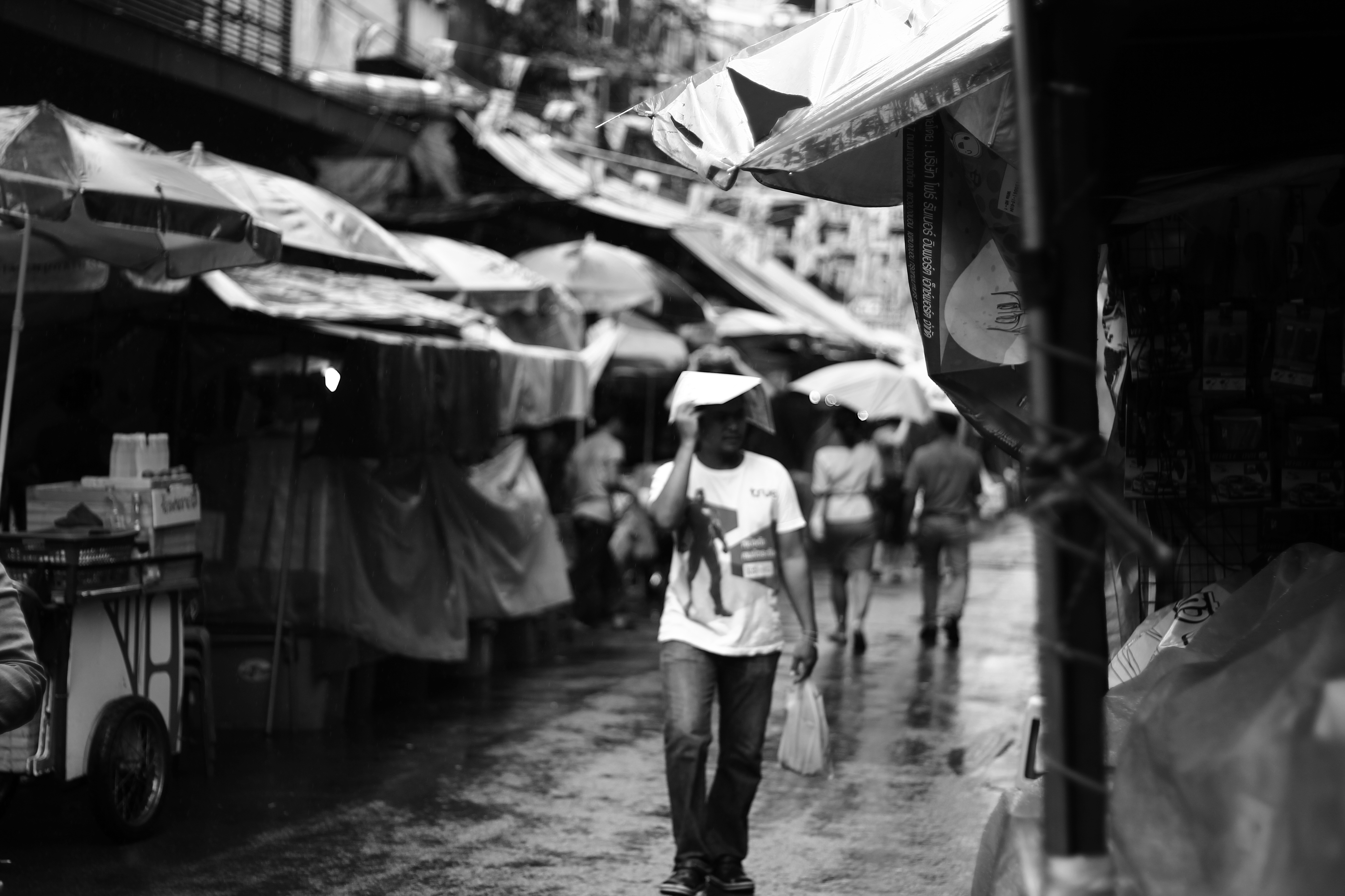 The rain doesn’t seem to be getting any lighter, so I take shelter under a small canopy of a street vendor while my friend goes into the market to find an umbrella.