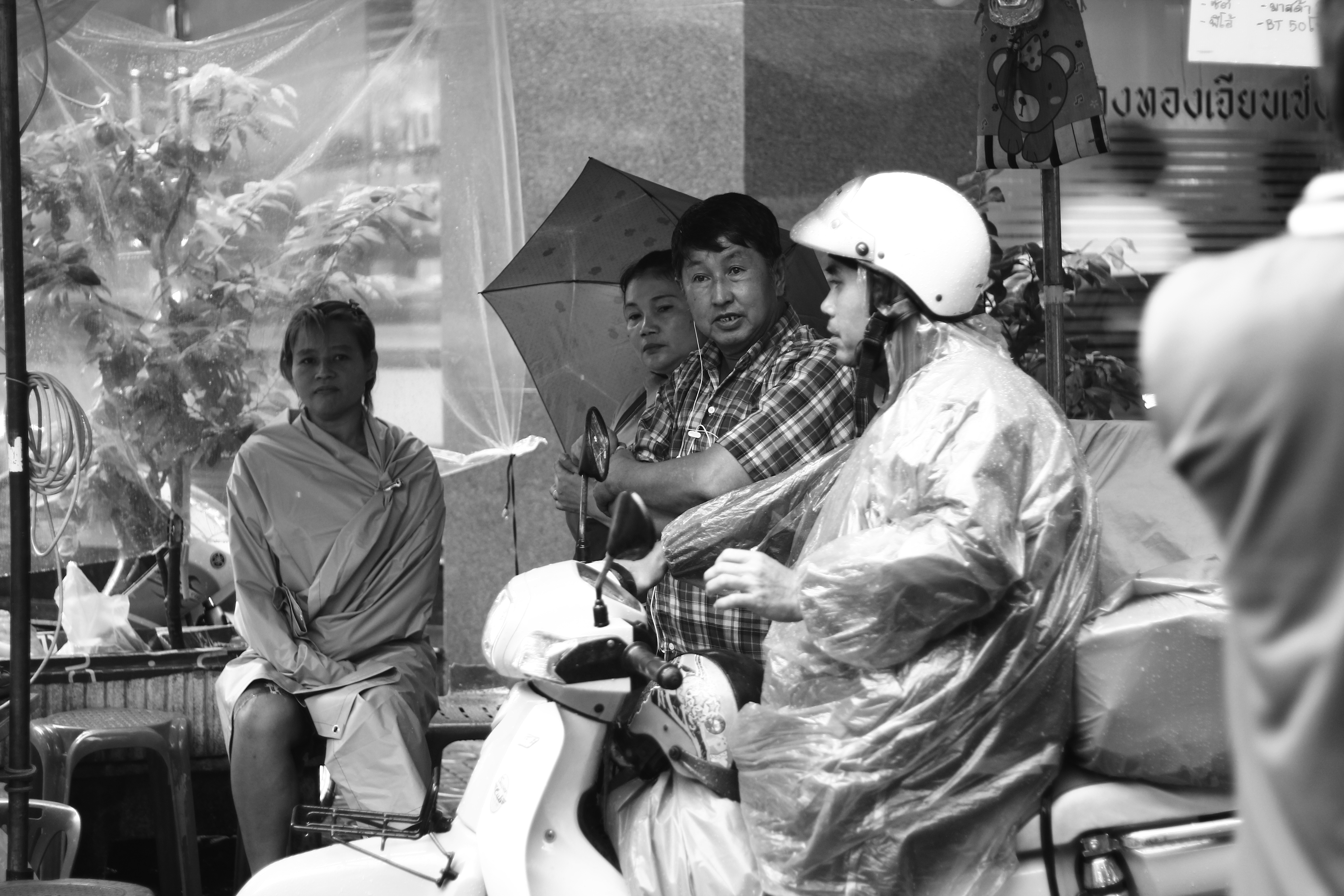 The locals seem to be used to this kind of weather. The sellers have swiftly and deftly covered their stalls with canvas sheets, and the motorbike riders are wearing baggy raincoats made out of thin plastic sheets.