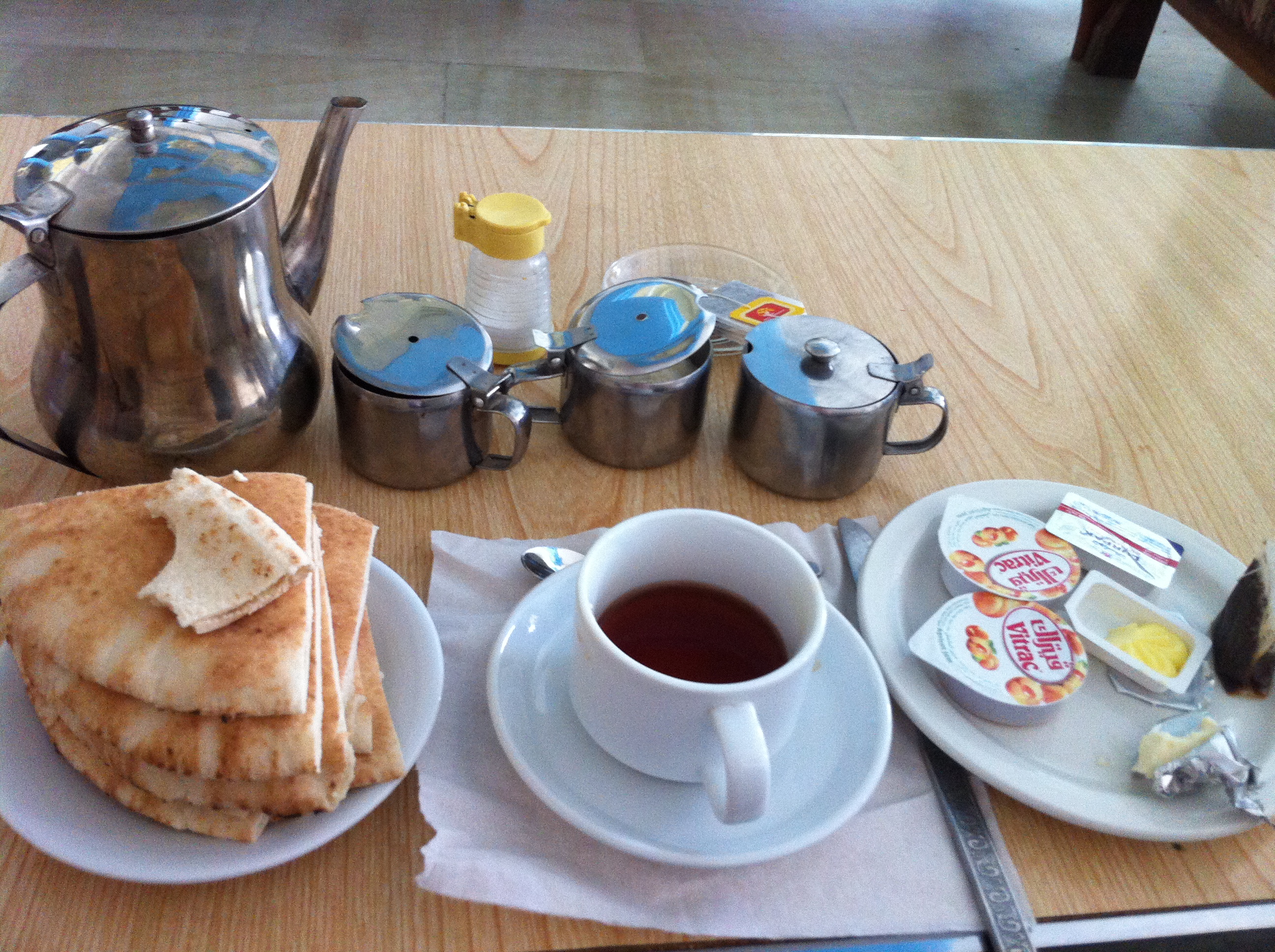 Then comes the time for lunch. It has been very windy whole day, and it takes some time for Id to find a suitable corner where we will be sheltered from sand blowing everywhere. Even with the blue jeep strategically parked to block our corner from the wind, simple activities continue to be a struggle. First we struggle to lay a mat on the ground, and then we cannot start the fire. Sand keeps blowing into our eyes and mouths making any sort of conversation impossible. As the last resort, Id makes some space at the back of the jeep and brings in the food inside. I grew up in Korea with the “floor culture”, so sitting and sleeping on the floor without any elevated furniture is a second nature to me. Id notices me sitting comfortably with my legs crossed and exclaims, “You are sitting like a Bedouin!” I feel smug, even if the pride I feel is something very childish.