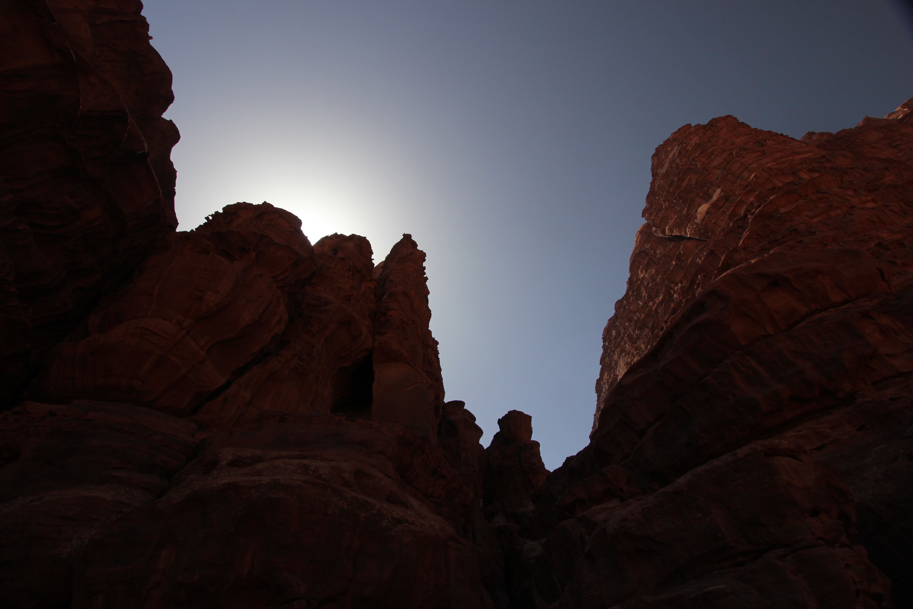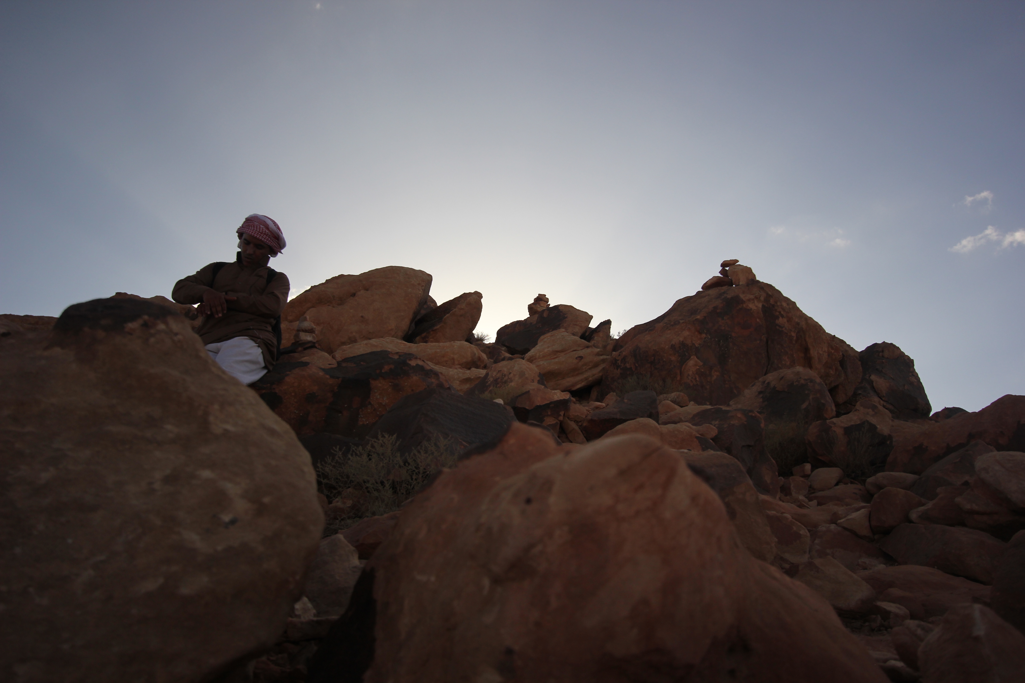 In the distance the wind and the sand has turned the sky cloudy, and it gets a little chilly in the shades. Id comes back having put on an extra garment that covers him from neck to foot, lies on the hard uneven floor of the rock, wraps his entire face with his red headscarf and falls asleep. He reminds me of an Egyptian mummy, Bedouin style.